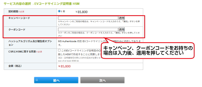 EVコードサイニング証明書HSM 新規お申し込みフォームサンプル ステップ1 お客様情報入力 支払担当者情報入力 ステップ2 お客様情報確認 ステップ3 サービス内容選択 ステップ4 ディスティングイッシュネーム情報入力 ステップ5 審査情報入力 ステップ6 支払い方法入力