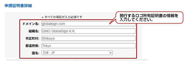 ※CMC(先使用ロゴ所有証明書)は、他のロゴ所有証明書とは異なり、ロゴデータのアップロードのみで申請可能なため、商標やロゴに関する情報の入力は不要です。