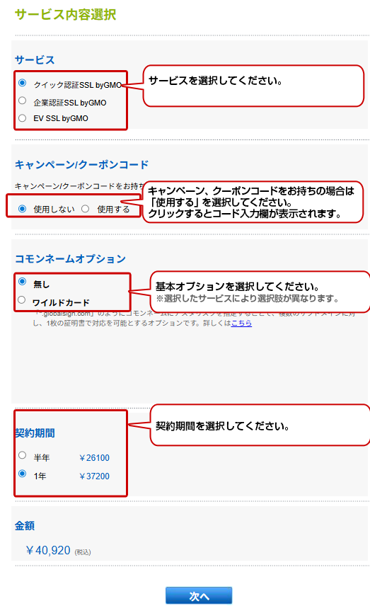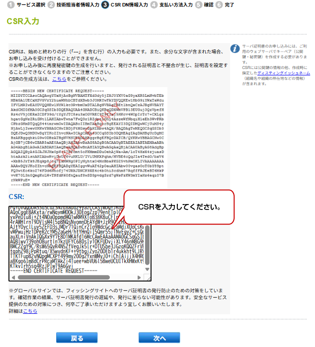 [新規]クイック認証SSL byGMO申込フォームサンプル ステップ1 サービス選択 ステップ2 契約者ユーザ情報入力 契約者・技術担当者・経理担当者などの登録情報について ステップ3 CSR入力 ステップ4 支払い方法入力 ※有償更新時のみ。無償更新の場合、お支払いは発生いたしません。 ステップ5 ドメインの認証