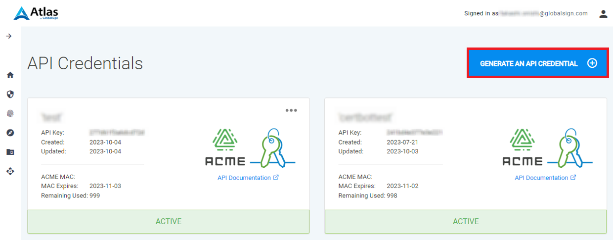 Atlasポータルにログインし、「Access Credentials」をクリック後「API Credentials」をクリックしてください。