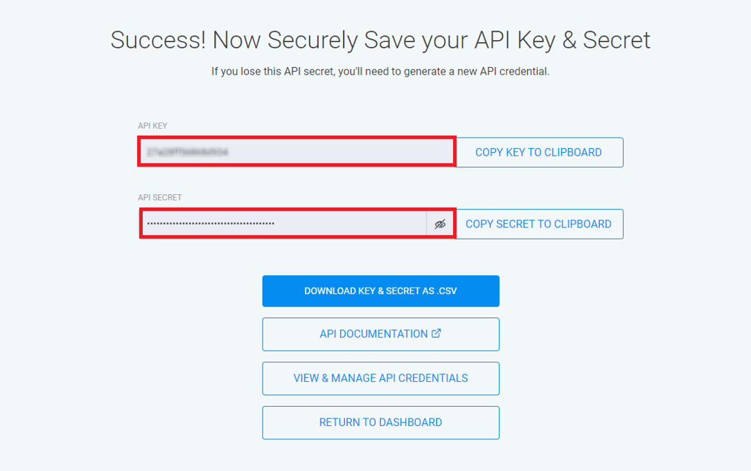 ※本例では「View and Copy」を選択しています。View and Copy:API keyとsecretをブラウザ上で生成し、クリップボードにコピーできます。CSV形式でダウンロードも可能です。