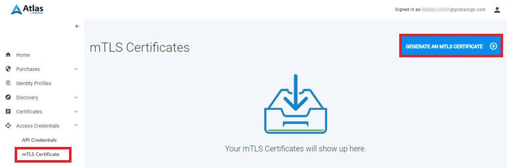 ポータルへログイン後、メニューから「mTLS Certificate」を選択し、「GENERETE AN MTLS CERTIFICATE」をクリックしてください。