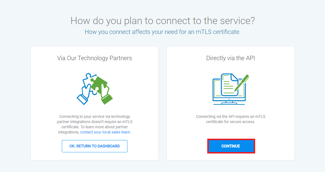 「Directly via the API」の「CONTINUE」ボタンをクリックしてください。