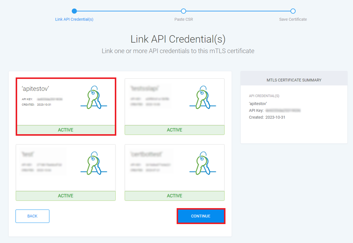 作成済みの「API Credentials」が表示されるため、利用する「API Credentials」を選択し「CONTINUE」をクリックしてください。