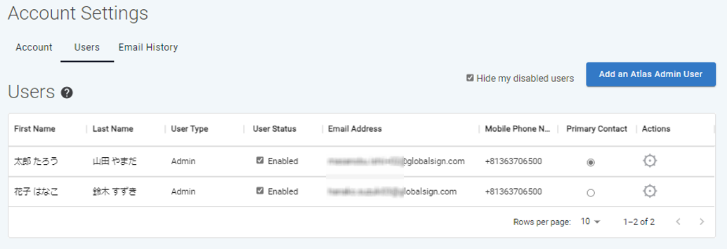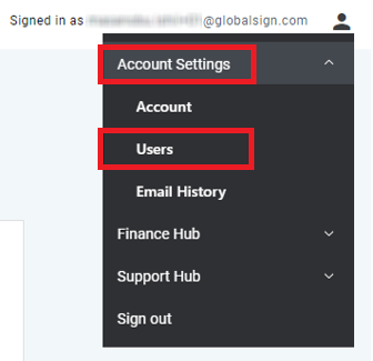 ポータル画面右上のメールアドレス右側にあるアイコンをクリックし、「Account Settings」内の「Users」を選択してください。