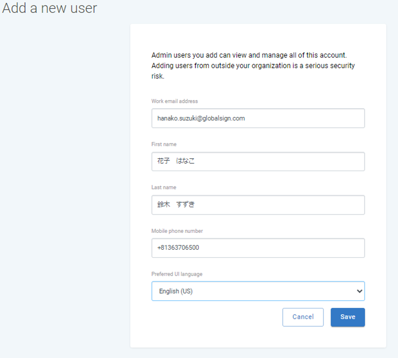 「Add a new user」の画面で新たなユーザー情報を入力してください。