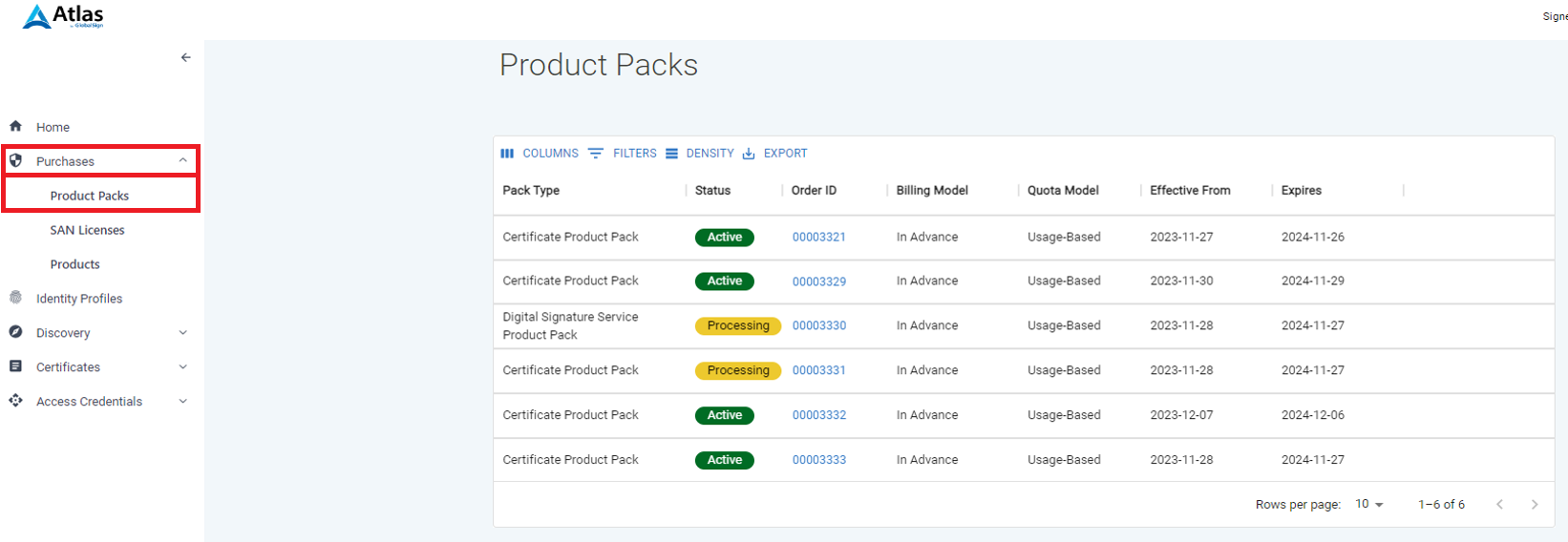 メニューから「Purchases」をクリック後「Product Packs」をクリックしてください。