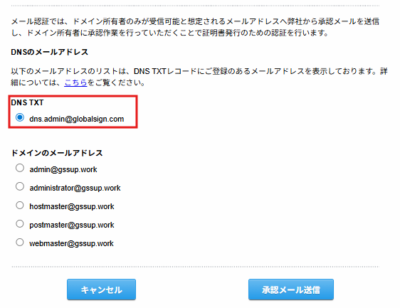 ※ドメイン管理者として想定されるメールアドレスの一覧は、実際にそのアドレスが存在しているかどうかに関わらず、一定のルールに則って表示されます。この一覧のいずれかのアドレスで認証を実施するためには、そのアドレスを準備(作成)いただけるかどうかがポイントとなります。ご自身での作成方法がご不明の場合は、ドメイン管理者にご依頼いただくか、「DNS TXTレコードに登録されているメールアドレス」での認証をご検討ください。