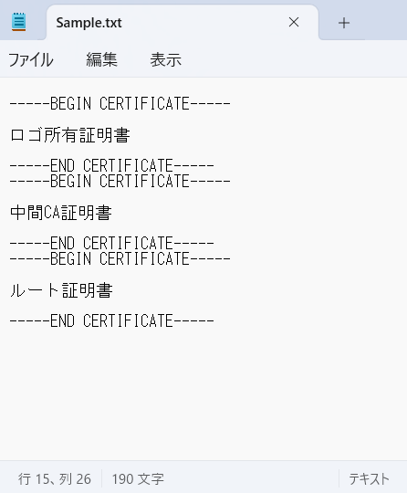 メモ帳(テキストエディタ)を開き下記の様にロゴ所有証明書、中間CA証明書、ルート証明書を結合します。